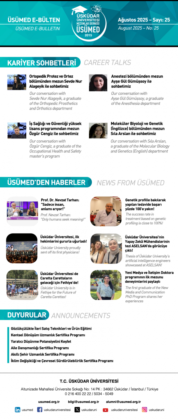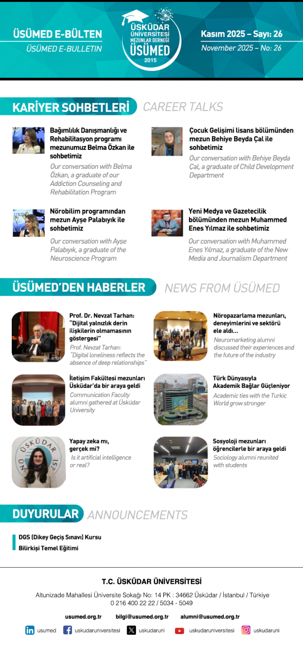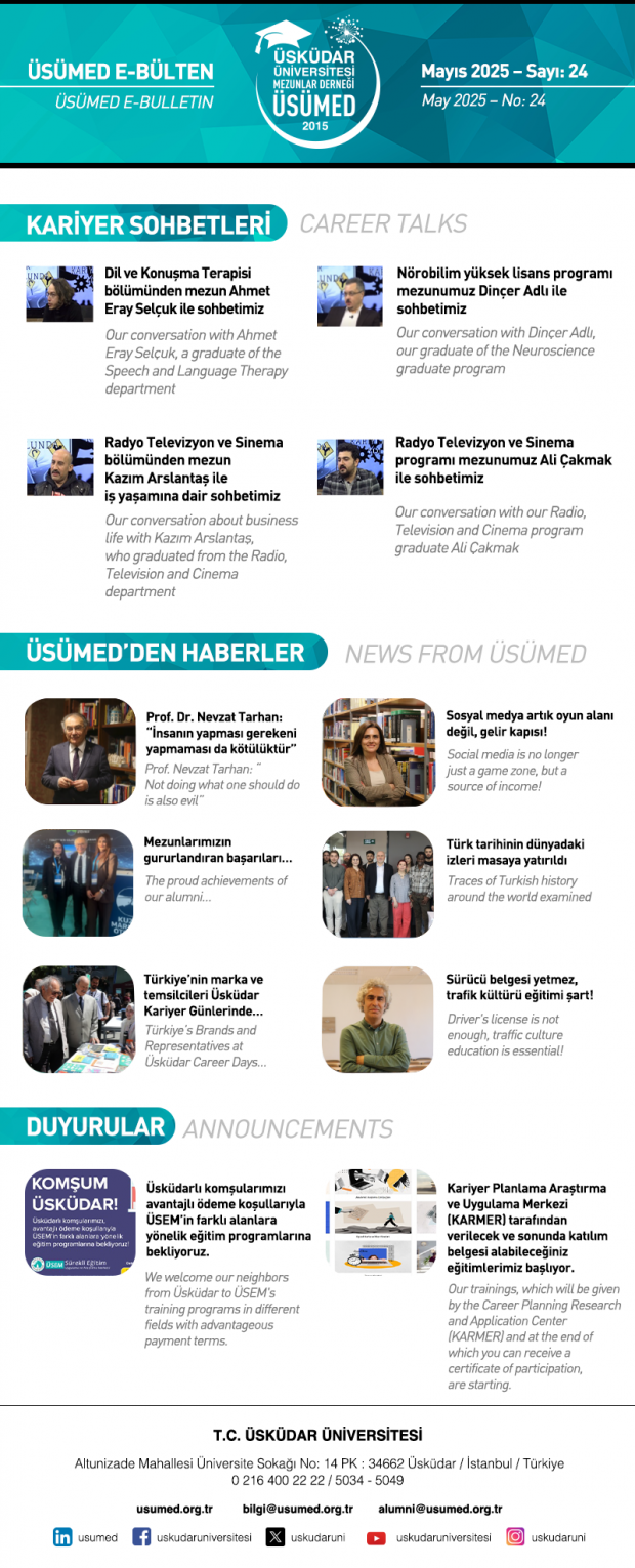 Üniversitemizden mezun öğrencilerimizi konuk ettiğimiz yayınlarımızdan, üniversitemize dair haberlerden ve duyurulardan örneklerle üç ayda bir kez Türkçe ve İngilizce olarak hazırlanan e-bülten yayınımıza dair sayılar: